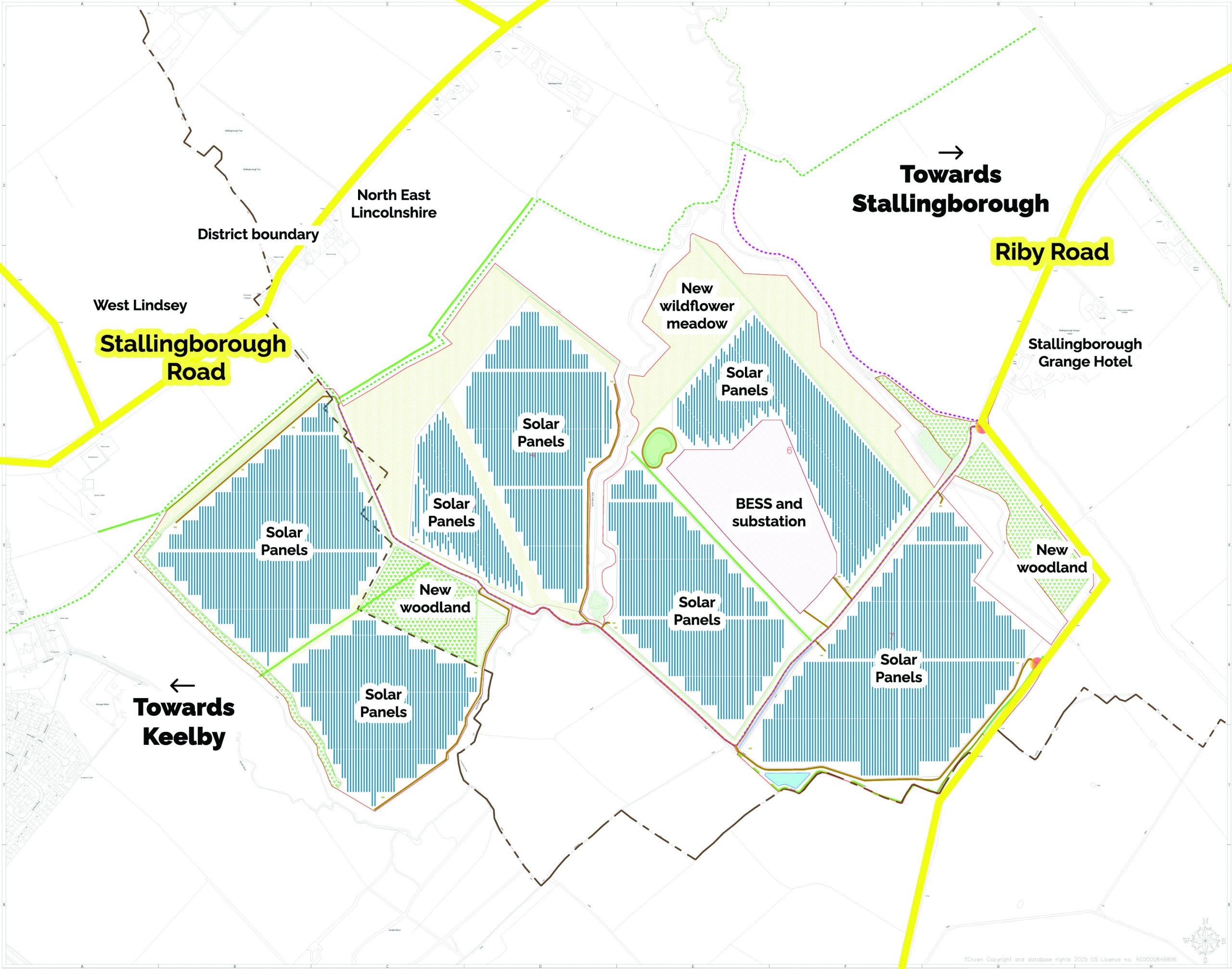 “Construction of solar farm and battery energy storage system, comprising ground mounted solar photovoltaic panels, battery containers, transformers, high voltage electrical substation and ancillary infrastructure including underground cabling, fencing, CCTV, internal access tracks, water storage tanks and an attenuation pond together with landscape enhancements, woodland and a permissive footpath for a temporary period of 40 years”.
